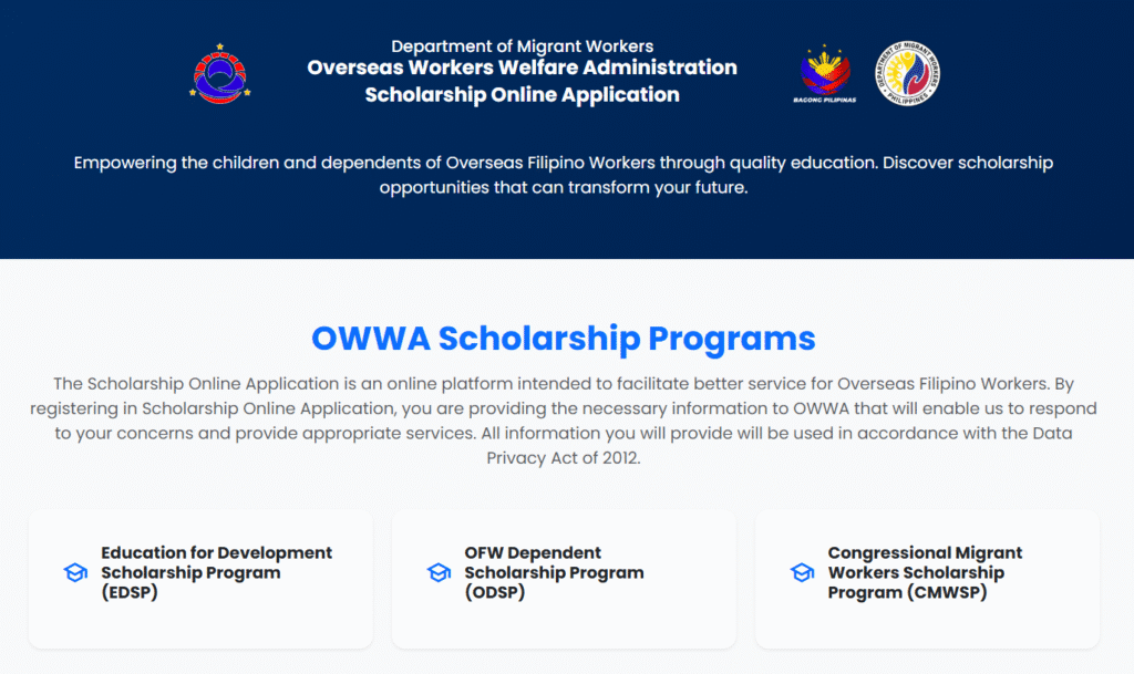 Note: OWWA is accepting online Application only for EDSP and CMWSP Scholarship Program for the academic year.